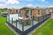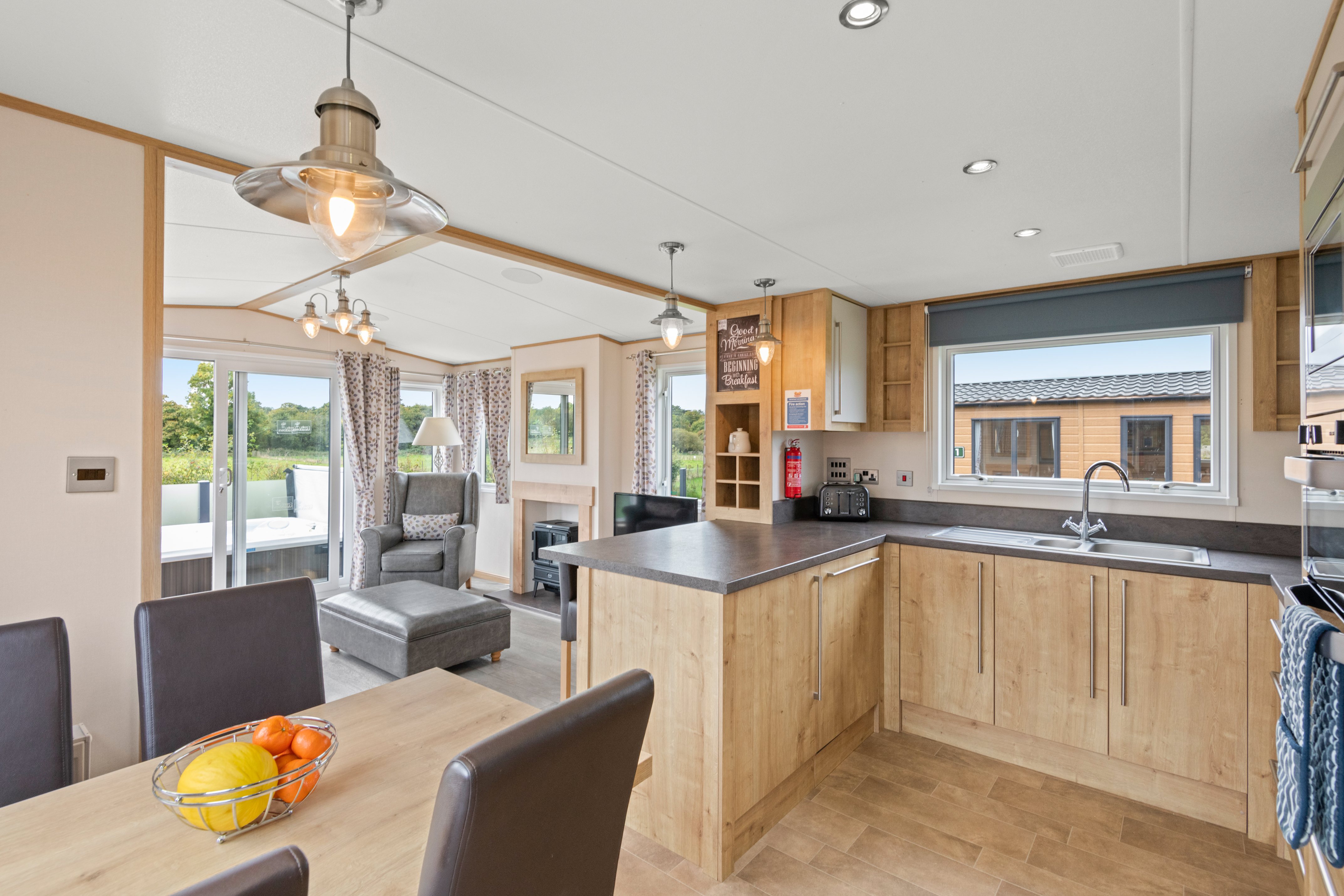 Including a designer kitchen that features a breakfast bar and integrated appliances, this luxury hot tub lodge also features a master bedroom with a king size bed and en suite bathroom.